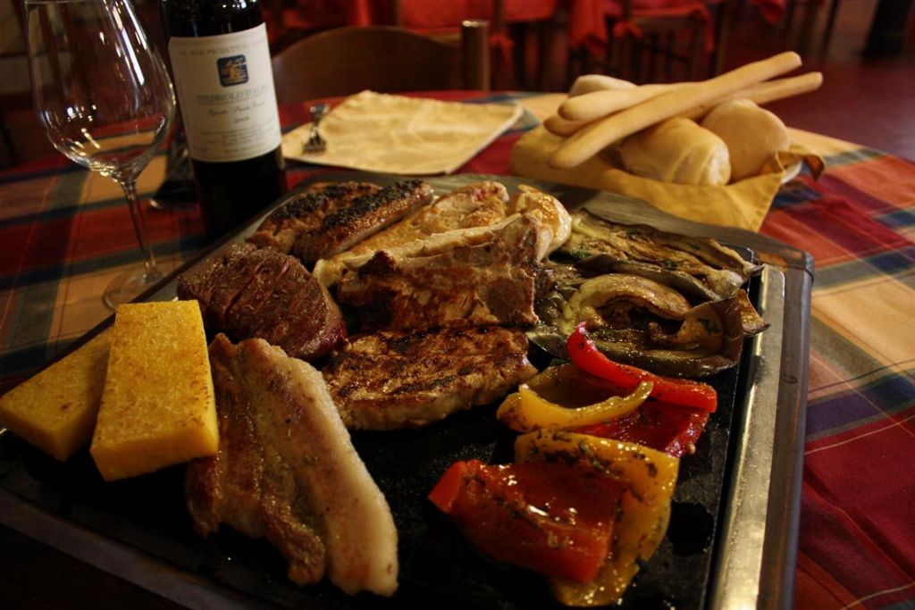 Nei secondi piatti prevale la carne ai ferri come la grigliata di carni miste servita su pietra ollare, la fiorentina di manzo, lo stracotto d'asino con polenta abbrustolita rigorosamente fatta in casa con paiolo di rame.
